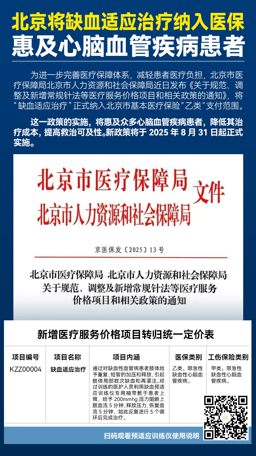 為進(jìn)一步完善醫(yī)療保障體系,減輕患者醫(yī)療負(fù)擔(dān),北京市醫(yī)療保障局北京市人力資源和社會(huì)保障局近日發(fā)布《關(guān)于規(guī)范、調(diào)整及新增常規(guī)針法等醫(yī)療服務(wù)價(jià)格項(xiàng)目和相關(guān)政策的通知》,將“缺血適應(yīng)治療”正式納入北京市基本醫(yī)療保險(xiǎn)"乙類"支付范圍。