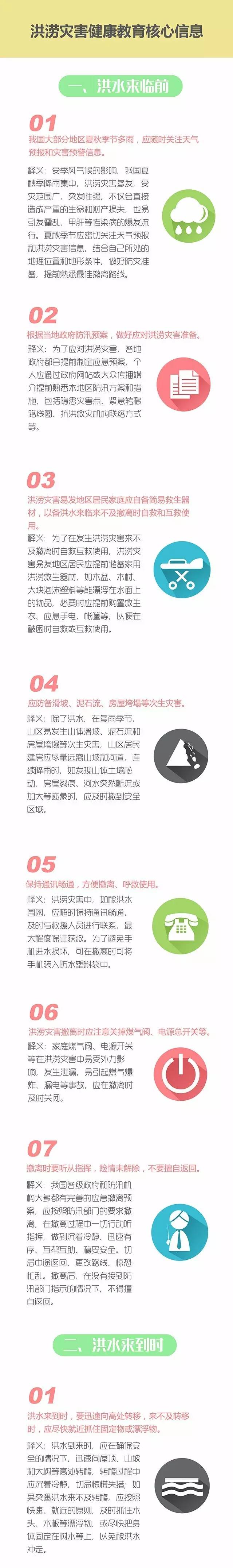 核心信息分別從洪水來臨前的應(yīng)對(duì)準(zhǔn)備、洪水來臨時(shí)如何呼救與安全轉(zhuǎn)移、災(zāi)后如何預(yù)防疾病,以及中暑癥狀、救治方法、高溫作業(yè)防護(hù)等方面,向公眾提供科學(xué)權(quán)威的健康知識(shí),對(duì)于提高公眾應(yīng)對(duì)洪澇災(zāi)害、中暑和災(zāi)后防病的能力具有重要意義。